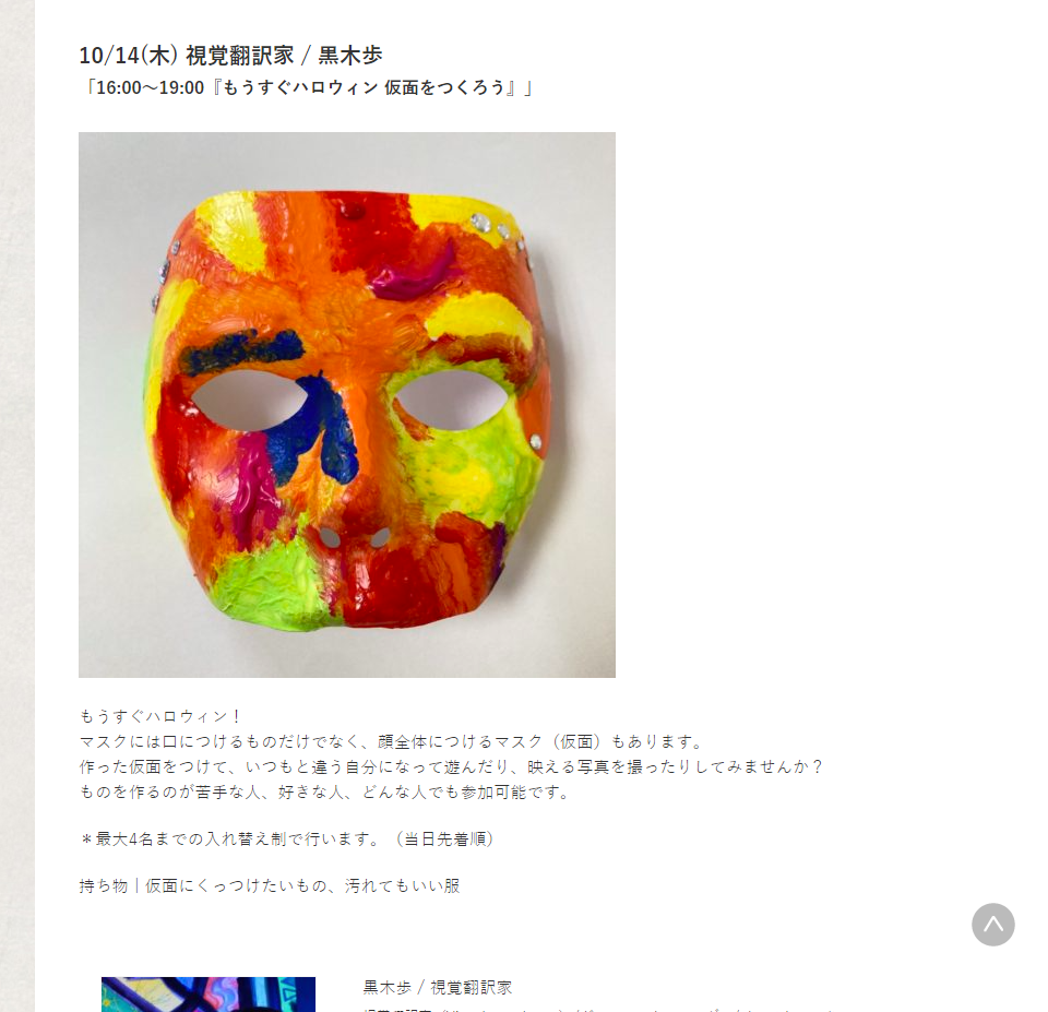 代官山ティーンズ・クリエイティブ 『もうすぐハロウィン 仮面をつくろう』 2021.10.13 FOR LIFE Tweet Share 代官山ティーンズ・クリエイティブ(代官山町7-9)では、10月14日(木)に、ミート・ザ・クリエイターズ『もうすぐハロウィン 仮面をつくろう』を開催するそうです。 https://daikanyama-tc.com/meet/2021_10_14 Tweet Share FOR LIFE, TIMELINE ワークショップ コメント: 0 SISON GALLERy 「ayanoguchiaya 04 colle... 代官山ティーンズ・クリエイティブ 『《連続講座》みんなで作ろう!葦(ヨシ)... ピックアップ記事 FOR STUDY 江戸時代の代官山 2019.10.28FOR STUDY, HISTORY FOR VISIT 小山登美夫セレクション「ブレイク前夜 in 代官山ヒルサイド... 2020.09.04FOR VISIT, REPORTS FOR VISIT ギャラリー巡り 2020.10.29 2020.11.02FOR VISIT, REPORTS 関連記事一覧 FOR LIFE 渋谷区の「年末年始における新型コロナウイルスの相談窓口」 2020.12.23 FOR VISIT GARDEN GALLERY 「アラジン展」 2020.11.14 FOR VISIT SUPREME ナイキ(NIKE)とのコラボレーション「Ai... 2020.10.17 FOR VISIT BESS MAGMA,LOGWAY NIPPON オープン 2021.04.08 FOR VISIT IL BISONTE 「ベガ コレクション(VEGA COL... 2021.09.09 FOR VISIT 庭「喫茶 庭」 2019.12.22 FOR VISIT Onitsuka Tiger 「デンティグレ(DENTIGR... 2020.10.09 FOR VISIT AIT「ストリートを取り戻す?都市空間を「自分のもの」にする... 2019.11.21 コメント ( 0 ) トラックバック ( 0 ) この記事へのコメントはありません。 この記事へのトラックバックはありません。 トラックバック URL 返信をキャンセルする。 名前 ( 必須 ) E-MAIL ( 必須 ) ※ 公開されません URL