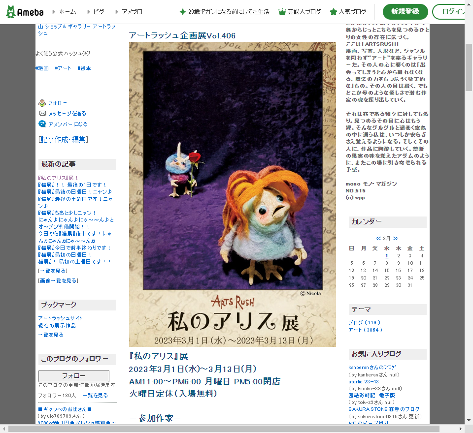 ARTS RUSH 「私のアリス」展 2023.03.02 FOR VISIT Tweet Share ARTS RUSH(恵比寿西2-14-10)では、3月1日(水)~13日(月)の期間、「私のアリス」展を開催しているそうです。 https://ameblo.jp/arts-rush/entry-12791581820.html https://www.facebook.com/permalink.php?story_fbid=pfbid0LRq7u5jF62PqyjyWZSrjLHrGr8osLm3axo341CNo8QYKz8UpSMrQVHnz9jC9F1dzl&id=100010394973218 Tweet Share FOR VISIT, TIMELINE アート コメント: 0 Styles イラストレーターBEY氏の個展「WAMERICAN WORL... 代官山ティーンズ・クリエイティブ 「DTC CREATIVE SESSIO... ピックアップ記事 FOR VISIT ぎゃらりー無垢里 最後の日 2021.02.10FOR VISIT, REPORTS, SCENERIES FOR STUDY ヒルサイドテラス 「2020年度グッドデザイン・ロングライフ... 2020.10.15FOR STUDY, FOR VISIT, TIMELINE FOR LIFE 猿楽祭(さるがくまつり) 2022 2022.11.06FOR LIFE, FOR VISIT, REPORTS 関連記事一覧 FOR LIFE 代官山ティーンズ・クリエイティブ 『DTCの日常を動画で撮っ... 2021.04.25 FOR VISIT WAREHOUSE 「SAMPLE SALE」 2021.03.13 FOR VISIT Gallery子の星 「TOKYO×PRINT×LANDSC... 2020.12.22 FOR LIFE 渋谷区 「渋谷区スポーツに関する意識調査」 2023.02.17 FOR VISIT Gallery子の星 「innocence ~共に長野で過ご... 2022.05.23 FOR VISIT ARTS RUSH 『~Merry Christmas~』展 2022.12.08 FOR VISIT NOJESS 「ポケットリング」 2022.03.05 FOR LIFE 代官山ティーンズ・クリエイティブ 『おうちにあるものを使って... 2020.08.30 コメント ( 0 ) トラックバック ( 0 ) この記事へのコメントはありません。 この記事へのトラックバックはありません。 トラックバック URL 返信をキャンセルする。 名前 ( 必須 ) E-MAIL ( 必須 ) ※ 公開されません URL