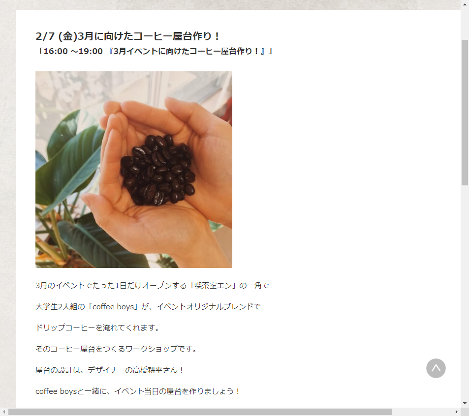 代官山ティーンズ・クリエイティブ「3月イベントに向けたコーヒー屋台作り!」 2020.02.05 FOR LIFE Tweet Share 代官山ティーンズ・クリエイティブ(代官山町7-9)では、2月7日(金)に、ミート・ザ・クリエイターズ『3月イベントに向けたコーヒー屋台作り!』を開催するそうです。 2/7 (金)3月に向けたコーヒー屋台作り! Tweet Share FOR LIFE, TIMELINE ワークショップ コメント: 0 KASHIYAMA DAIKANYAMA : 杏橋幹彦写真展「Mikihi... ART FRONT GALLERY : 久野彩子 個展「line」 ピックアップ記事 FOR VISIT 小山登美夫セレクション「ブレイク前夜 in 代官山ヒルサイド... 2020.09.04FOR VISIT, REPORTS FOR STUDY 大正時代の都市計画と昭和初期の代官山の道路事情 2020.09.10FOR STUDY, HISTORY FOR LIFE メゾン代官山解体工事説明会 2020.06.19 2020.06.22FOR LIFE, FOR STUDY, REPORTS 関連記事一覧 FOR VISIT JOYFIT+代官山 閉店 2021.01.29 FOR LIFE 代官山ティーンズ・クリエイティブ 『自分色のマシュマロを作ろ... 2022.08.01 FOR LIFE 代官山ティーンズ・クリエイティブ 『新米と手作り梅干しで作る... 2022.11.28 FOR VISIT L’OFFICINE UNIVERSELLE B... 2020.11.25 FOR VISIT GARDEN GALLERY 「にっぽんの暮らし展2021」 2020.12.26 FOR VISIT nanamica MOUNTAIN 「THE NORTH F... 2022.03.19 FOR VISIT co-ba ebisu「Twitterを活用した、個のブラン... 2020.02.09 FOR LIFE しぶや区ニュース 令和4年(2022年)2月1日号 2022.01.30 コメント ( 0 ) トラックバック ( 0 ) この記事へのコメントはありません。 この記事へのトラックバックはありません。 トラックバック URL