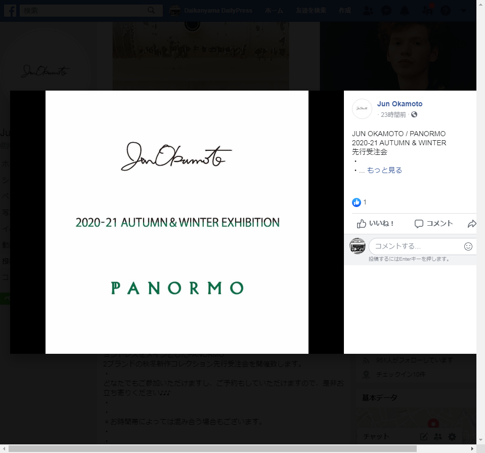 JUN OKAMOTO(代官山町12-3)では、3月20日(金)~23日(月)、3月27日(金)~29日(日)の期間、「JUN OKAMOTO / PANORMO 2020-21 AUTUMN & WINTER 先行受注会」を開催するそうです。