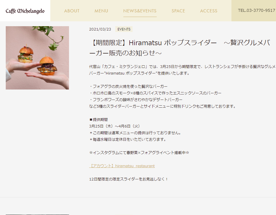 Caffe Michelangelo(猿楽町29-3)では、3月25日(木)~4月6日(火)の期間、グルメバーガーを提供する「Hiramatsu ポップスライダー」を開催するそうです。